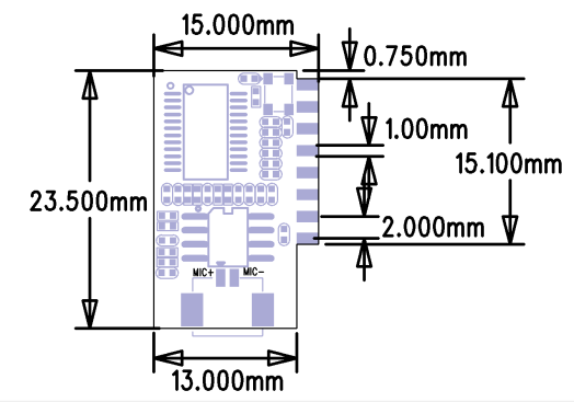 模组为单面贴装,单面出脚,模块支持单麦克风输入,可以直接接入模块;同时支持真人语音